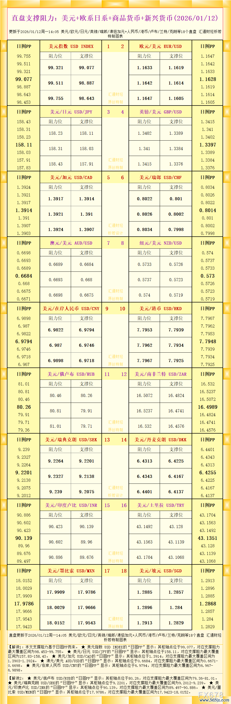 汇通财经APP讯——一张图看直盘支撑阻力:美元+欧系日系+商品货币+新兴货币,更新于2026年1月12日周一14:05,具体美元/欧元/日元/英镑/瑞郎/澳纽加元+人民币/港币/卢布/兰特/克朗等18个直盘,更多详见汇通财经析若特制图表中的内容。