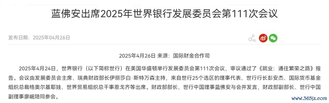财政部、中国人民银行网站4月26日消息沪深配,4月24日,世界银行在美国华盛顿举行发展委员会第111次会议,财政部部长、世行中国理事蓝佛安与会并发言;4月24日—25日,国际货币基金组织在美国华盛顿特区召开第51届国际货币与金融委员会(IMFC)会议,中国人民银行行长潘功胜出席会议并发言。