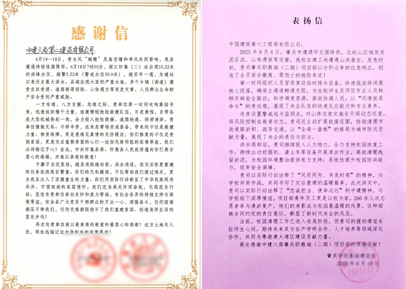 项目团队收到来自肇庆市政府及相关部门的感谢表扬信,在怀集县政府的感谢信中描绘道:“在危难时刻,中建六局挺身而出,展现了央企的担当与温度。”